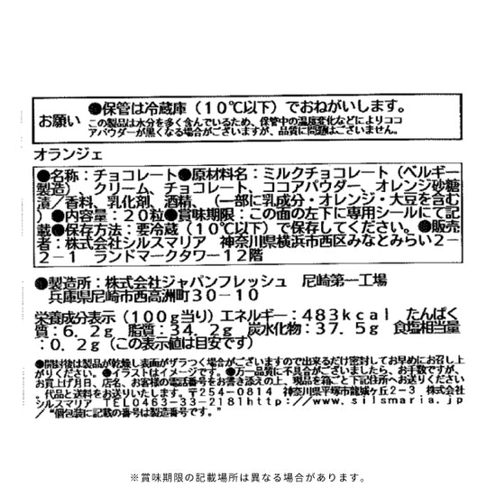 | 原材料名 | ミルクチョコレート(ベルギー製造)、クリーム、チョコレート、ココアパウダー、オレンジ砂糖漬/香料、乳化剤、酒精、(一部に乳成分・オレンジ・大豆を含む) |