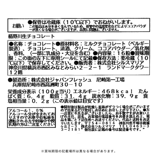 | 原材料名 | ミルクチョコレート(ベルギー製造)、チョコレート、清酒、クリーム、ココアパウダー/乳化剤、香料、(一部に乳成分・大豆を含む) |