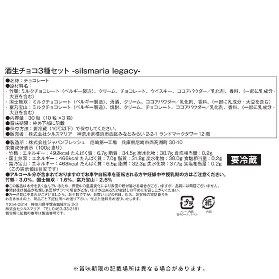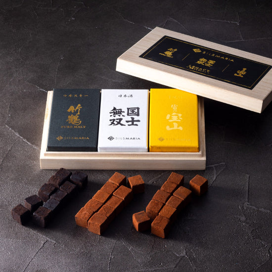 | 原材料名 | 【竹鶴】ミルクチョコレート(ベルギー製造)、クリーム、チョコレート、ウイスキー、ココアパウダー/乳化剤、香料、(一部に乳成分・ 大豆を含む) 【国士無双】ミルクチョコレート(ベルギー製造)、清酒、クリーム、ココアパウダー/乳化剤、香料、(一部に乳成分・大豆を含む) 【富乃宝山】ミルクチョコレート(ベルギー製造)、焼酎、クリーム、チョコレート、ココアパウダー/乳化剤、香料、(一部に乳成分・ 大豆を含む) |
