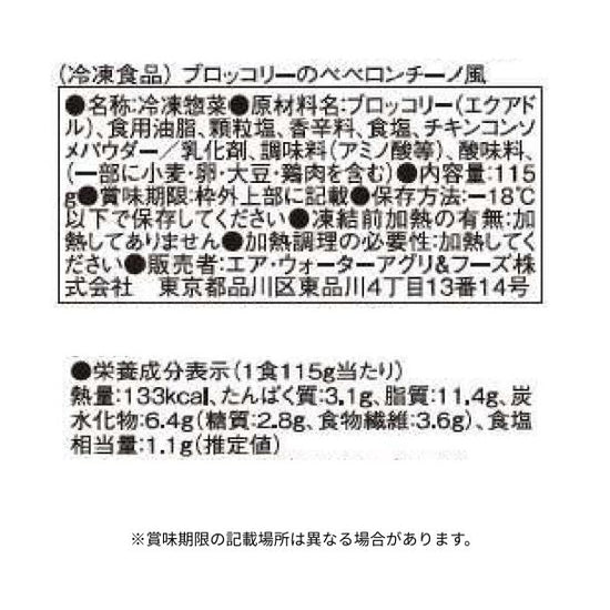 | 原材料名 | ブロッコリー(エクアドル)、食用油脂、顆粒塩、香辛料、食塩、チキンコンソメパウダー/乳化剤、調味料(アミノ酸等)、酸味料、(一部に小麦・卵・大豆・鶏肉を含む) |
