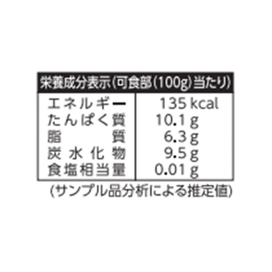| 栄養成分 | (可食部100g当たり)エネルギー:135kcal、たんぱく質:10.1g、脂質:6.3g、炭水化物:9.5g、食塩相当量:0.01g |