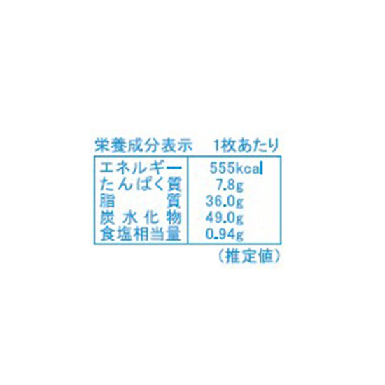 | 栄養成分 | (1枚当たり)エネルギー:555kcal、たんぱく質:7.8g、脂質:36.0g、炭水化物:49.0g、食塩相当量:0.94g |