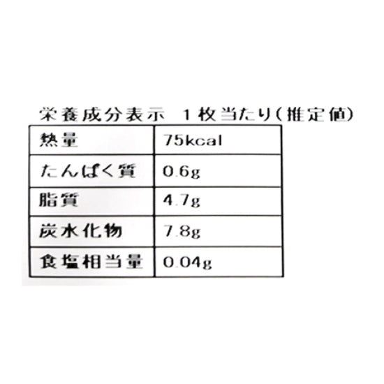 | 栄養成分 | (1枚当たり)エネルギー:75kcal、たんぱく質:0.6g、脂質:4.7g、炭水化物:7.8g、食塩相当量:0.04g |