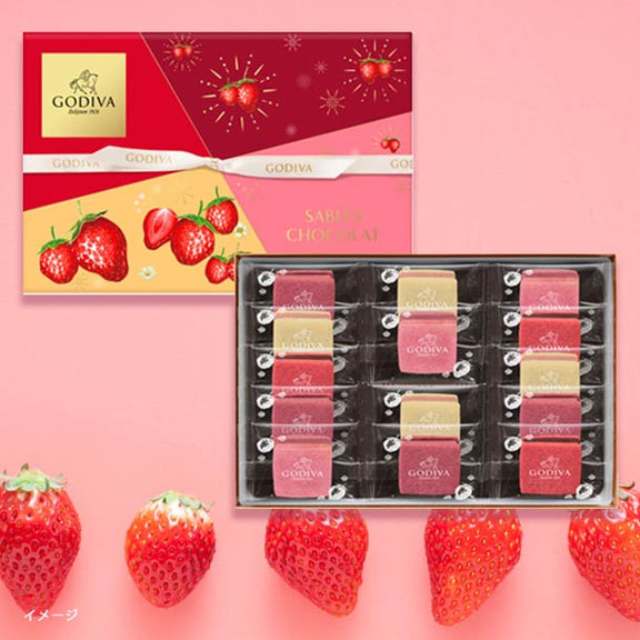 サクっと焼き上げたサブレでなめらかなチョコレートガナッシュをサンドしました。限定の「ストロベリー」フレーバー4種を苺のイラストが可愛らしいボックスに詰め合わせました。