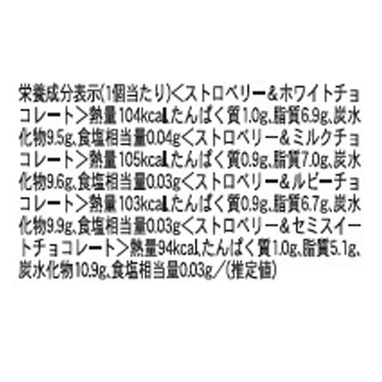 | 栄養成分 | (1個当たり) 【ストロベリー&ホワイトチョコレート】エネルギー:104kcal、たんばく質1.0g、脂質:6.9g、炭水化物:9.5g、食塩相当量:0.04g 【ストロベリー&ミルクチョコレート】エネルギー:105kcal、たんばく質:0.9g、脂質:7.0g、炭水化物:9.6g、食塩相当量:0.03g 【ストロベリー&ルビーチョコレート】エネルギー:103kcal、たんばく質:0.9g、脂質:6.7g、炭水化物:9.9g、食塩相当量:0.03g 【ストロベリー&セミスイートチョコレート】エネルギー:94kcal、たんぱく質:1.0g、脂質:5.1g、炭水化物:10.9g、食塩相当量:0.03g |