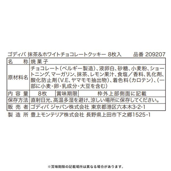 | 原材料名 | チョコレート(ベルギー製造)、液卵白、砂糖、小麦粉、ショートニング、マーガリン、抹茶、レモン果汁、食塩/香料、乳化剤、酸化防止剤(V.E、ヤマモモ抽出物)、着色料(カロテン)、(一部に小麦・卵・乳成分・大豆を含む)
