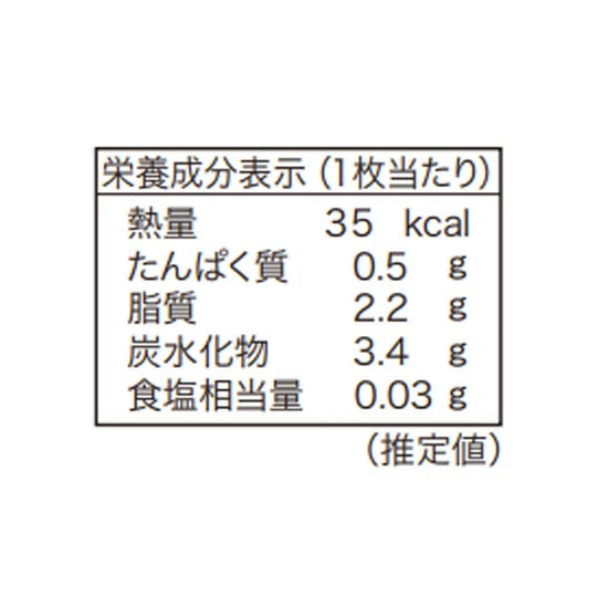 | 栄養成分 | (1枚当たり)エネルギー:35kcal、たんぱく質:0.5g、脂質:2.2g、炭水化物:3.4g、食塩相当量:0.03g |