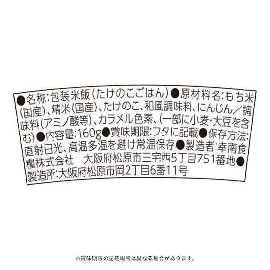 | 原材料名 | もち米(国産)、精米(国産)、たけのこ、和風調味料、にんじん/調味料(アミノ酸等)、酒精、カラメル色素、増粘剤(キサンタンガム)、(一部に小麦・大豆を含む) |