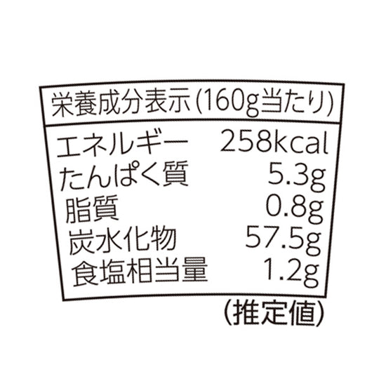 | 栄養成分 | (1個160g当たり)エネルギー:268kcal、たんぱく質:5.2g、脂質:0.8g、炭水化物:57.2g、食塩相当量:1.1g |