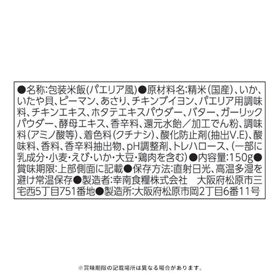 | 原材料名 | 精米(国産)、いか、いたや貝、ピーマン、あさり、チキンブイヨン、パエリア用調味料、チキンエキス、ホタテエキスパウダー、バター、ガーリックパウダー、酵母エキス、香辛料、還元水飴/加工でん粉、調味料(アミノ酸等)、着色料(クチナシ)、酸化防止剤(抽出V.E)、酸味料、香料、香辛料抽出物、pH調整剤、トレハロース、(一部に乳成分・小麦・えび・いか・大豆・鶏肉を含む) ※本品が使用しているあさりにはかにが共生している場合があります。 |