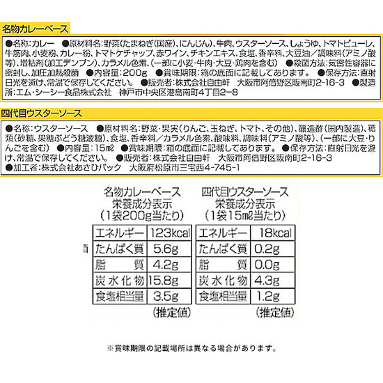 原材料名 【カレー】野菜(たまねぎ(国産)、にんじん)、牛肉、ウスターソース、しょうゆ、トマトピューレ、牛筋肉、小麦粉、カレー粉、トマトケチャップ、赤ワイン、チキンエキス、食塩、香辛料、大豆油/調味料(アミノ酸等)、増粘剤(加工デンプン)、カラメル色素、(一部に小麦・牛肉・大豆・鶏肉を含む)