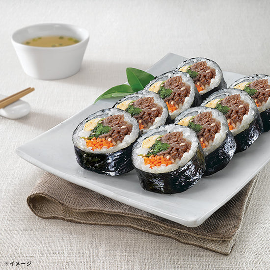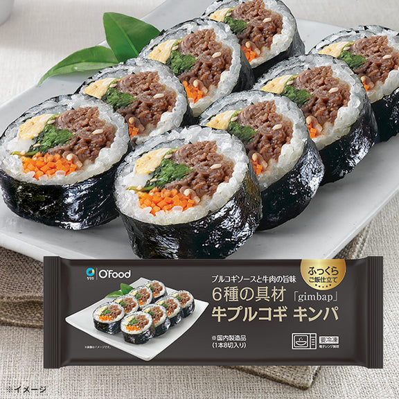 旨みたっぷり牛肉プルコギのキンパ自社製プルコギソースとたくあんを使用し、ふっくらごはんとナムルが食欲をそそる自信作です。6種の具材をたっぷり使い、お店の味を再現しました。