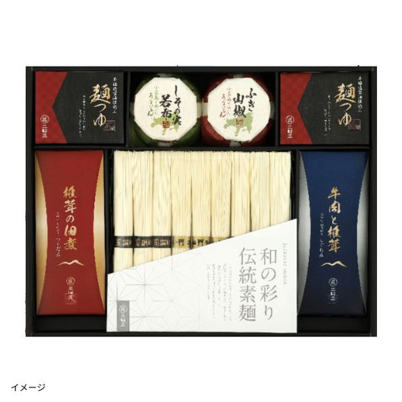 | 内容量 | 讃岐そうめん:50g×6、 手延べそうめん:50g×3、 牛肉と椎茸のしぐれ煮:55g×1、 椎茸佃煮:55g×1、 しその実若布:50g×1、 ふき山椒:45g×1、 麺つゆ:15g×4/セット |
