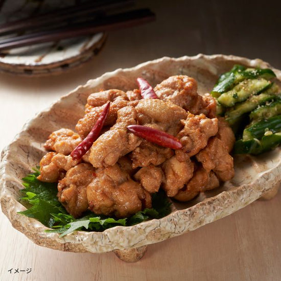 みつせ鶏のそで肉をオーブンでふっくらと焼き上げました。ピリ辛でジューシーな美味しさがやみつきに♪ロングセラーの山賊焼きを骨なしで食べやすくしました!