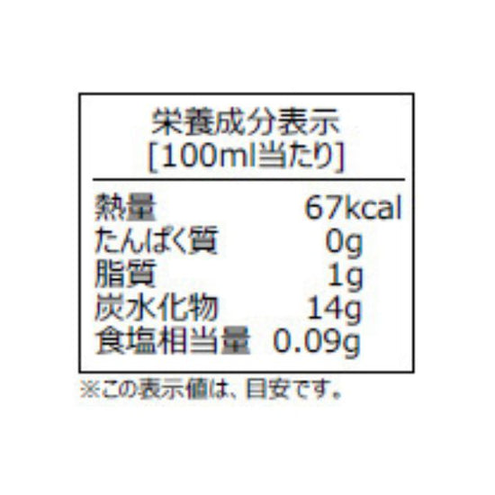 | 栄養成分 | (100mlあたり)エネルギー:67kcal、たんぱく質:0g、脂質:1g、炭水化物:14g、食塩相当量:0.09g |