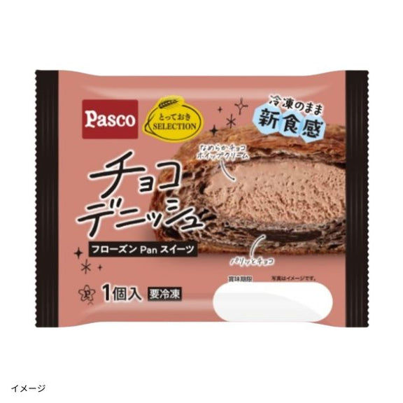 冷凍庫から出し、凍ったままでも美味しく食べられるチョコデニッシュ。生地にはチョコクリームを折り込んでおり、チョコを満喫できます。凍ったままで食べると、包んで焼いたチョコがパリッとしてチョコホイップクリームがアイスのような食感です。