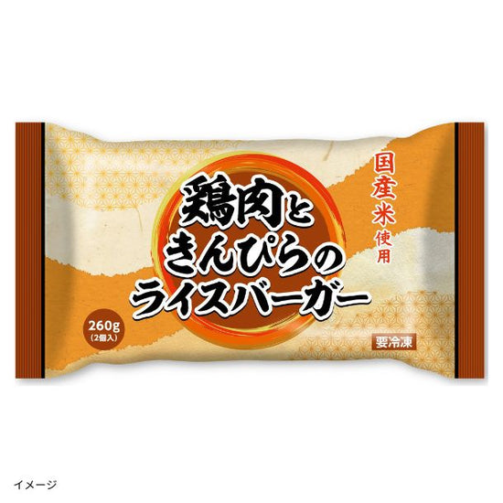 国産米を使用したライスバーガー醤油を噴霧しこんがり焼き上げたライスパテに甘辛く味をつけた鶏肉と2種野菜(にんじん・ごぼう) をはさみました。