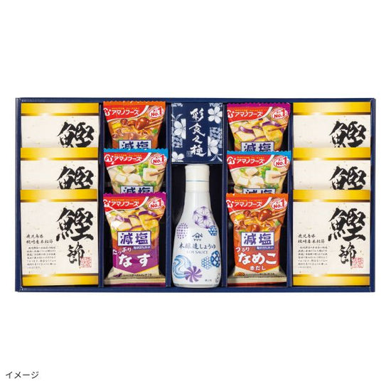 | 内容量 | 減塩いつものおみそ汁(なす)9g×2、減塩いつものおみそ汁(なめこ)8g×2、減塩いつものおみそ汁(とうふ)10.3g×2、鰹節本枯節2.5g×6、 鮮度卓上しょうゆ200ml×1/セット |