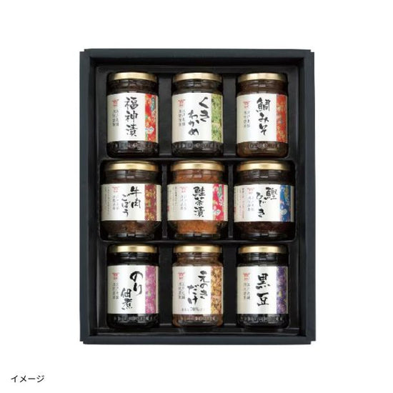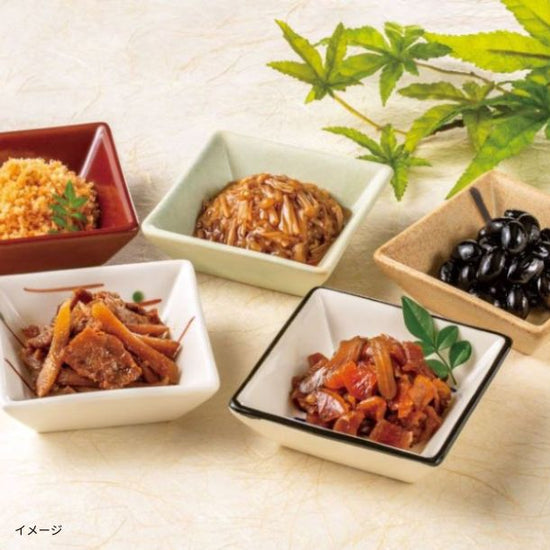 | 内容量 | 福神漬:90g、くきわかめ:75g、のり佃煮:95g、鮭茶漬:60g、鯛みそ :100g、黒豆:100g、えのきだけ:90g、牛肉ごぼう 55g、鰹ひじき 40g/箱 |