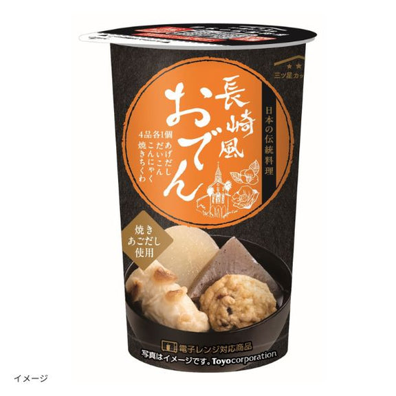 | 原材料名 | 大根(中国)、揚げかまぼこ、こんにゃく、焼きちくわ、しょうゆ、砂糖、食塩、焼きあごだし、かつお削りぶし、昆布/加工でん粉、ソルビトール、調味料(アミノ酸等)、炭酸カルシウム、水酸化カルシウム(こんにゃく用凝固剤)、(一部に卵・小麦・大豆を含む) ※揚げかまぼこ、焼きちくわで使用している魚は「えび・かに」を食べています。 |
