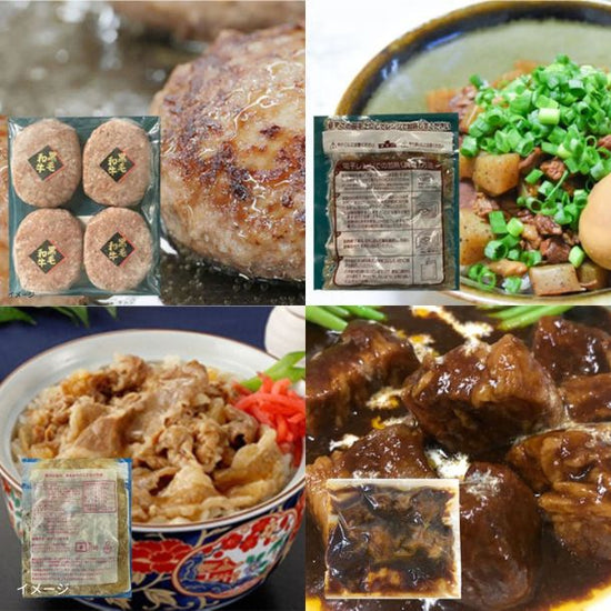 | 内容量 | 黒毛和牛ハンバーグ:120g×4個、 黒毛和牛牛丼:130g×1個、 牛すじ煮込:150g×1個、 ビーフシチュー:200g×1個/セット |