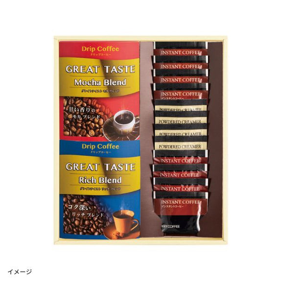 | 内容量 | ドリップコーヒー(モカ・リッチ・ビターの中から8袋)、インスタントコーヒー:2g×8袋、クリーミーパウダー:2.5g×4袋/セット |