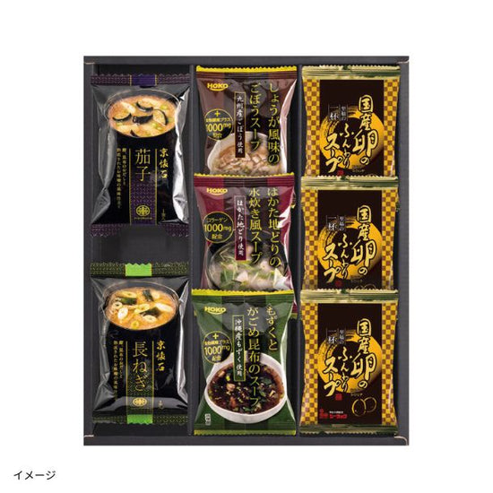 | 内容量 | マルコメ 京懐石味噌汁(茄子・豆腐・長ねぎ・野菜の中から2袋)、 宝幸 フリーズドライスープ (水炊き風スープ・ごぼうスープ・もずくスープの中から3袋)、 シーラック 国産卵のふんわりスープ:5.5g×3袋/セット |
