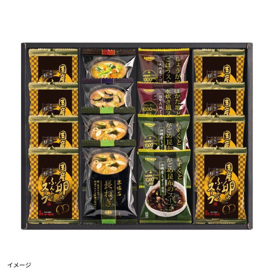 | 内容量 | マルコメ 京懐石味噌汁(茄子・豆腐・長ねぎ・野菜の中から4袋)、 宝幸 フリーズドライスープ (水炊き風スープ・ごぼうスープ・もずくスープの中から4袋)、 シーラック 国産卵のふんわりスープ:5.5g×8袋/セット |