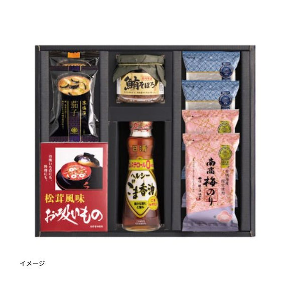 日清ヘルシーごま香油、マルコメ 京懐石味噌汁、永谷園 松茸風味のお吸い物、男鹿の塩海苔、有明海産 南高梅海苔、しょうが風味鮪そぼろの詰め合わせです。