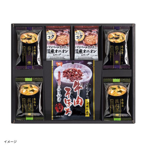 | 内容量 | 牛肉そぼろふりかけ:40g×1袋、カマンベールチーズ入オニオンスープ:8g×2袋、マルコメ 京懐石味噌汁(茄子・豆腐・長ねぎ・野菜の中から4袋)/セット |