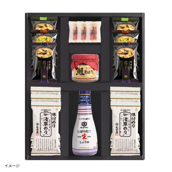 キッコーマンしぼりたて生しょう油、マルコメ京懐石味噌汁、浅草のり(味のり) 、紀州産南高梅(個包装)、鮭そぼろの詰め合わせです。