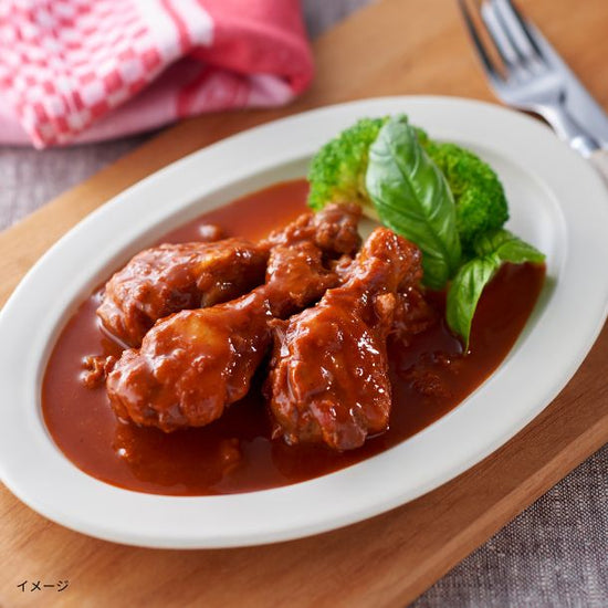 | 原材料名 | 骨付き鶏肉(国産)、トマトピューレー、ハヤシフレーク、オニオンソテー、砂糖、チキンコンソメ、おろしにんにく、オリーブ油、こしょう/加工デンプン、着色料(カラメル、パプリカ色素)、調味料(アミノ酸等)、香料、(一部に小麦・乳成分・大豆・鶏肉・豚肉を含む) |