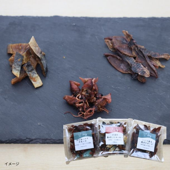 | 内容量 | さばの香ばしジャーキー:50g、 ほたるいかのスモーク:25g、 いしり香る焼ほたるいか:25g/セット |