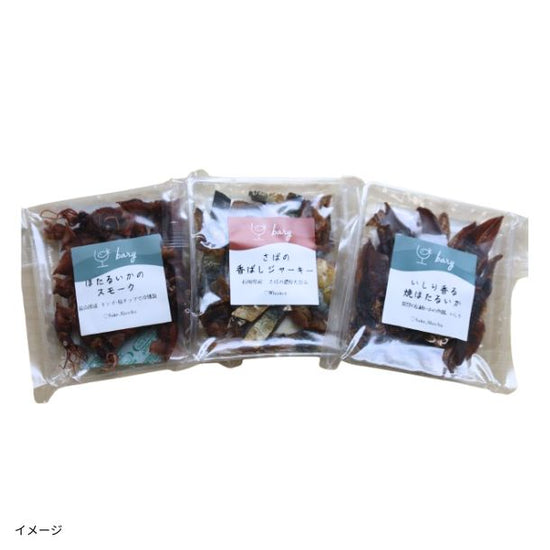 | 原材料名 | 【さばの香ばしジャーキー】さば(石川県産)、オリーブオイル、チキンエキス調味料、食塩/調味料(アミノ酸等)、(一部に小麦・さば・大豆・鶏肉を含む) 【ほたるいかのスモーク】ほたるいか(富山県産)、食塩 【いしり香る焼ほたるいか】ほたるいか(国産)、食塩、魚しょうゆ(いか、食塩)、砂糖 |