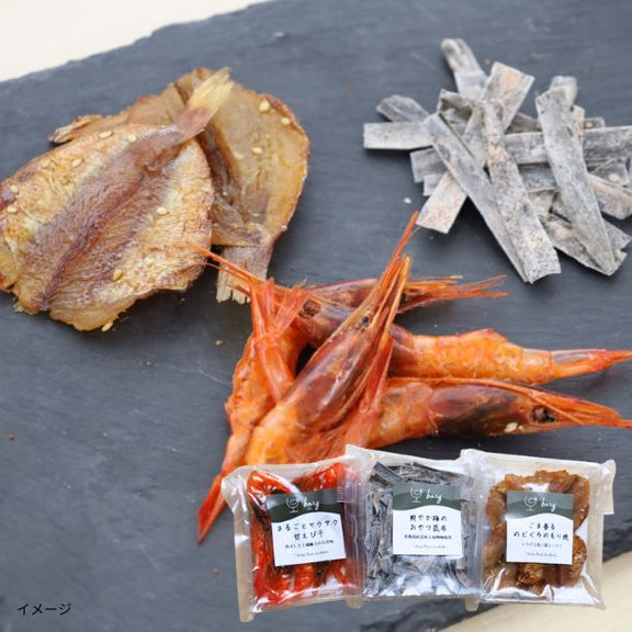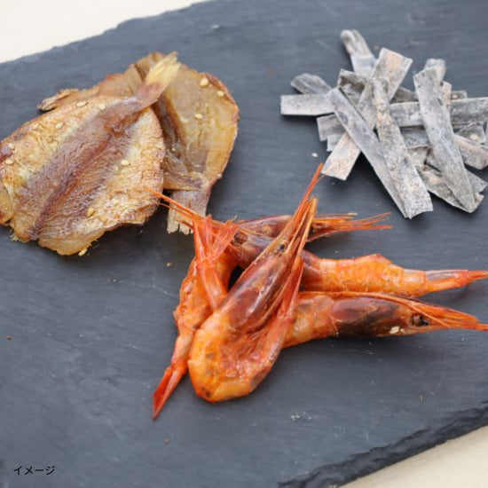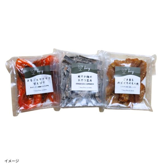 | 内容量 | まるごとサクサク甘えび干: 20g、 爽やか梅のおやつ昆布:20g、 ごま香るのどぐろの炙り焼:37g/セット |