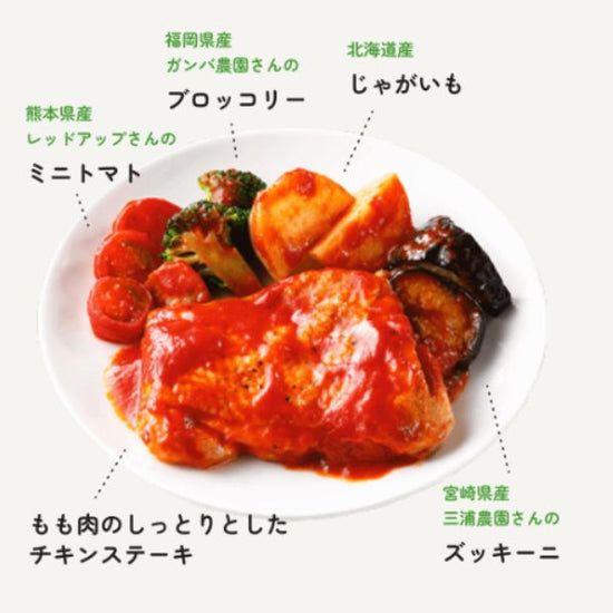 | 原材料名 | チキンステーキ[鶏肉、小麦粉、植物油脂、揚げ油(パーム油)、しょうがペースト、酒、食塩、粉末卵白、粉末状植物性たん白、香辛料、米粉](タイ製造)、ソース[トマト、たまねぎ、植物油脂、食塩、にんにく、砂糖、チキンエキス、ポークパウダー、黒胡椒]、フライドポテト[ばれいしょ、植物油脂]、ズッキーニ、ミニトマト、ブロッコリー/加工でん粉、キシロース、調味料(アミノ酸等)、酸味料、(一部に小麦・卵・乳成分・大豆・鶏肉・豚肉・ゼラチンを含む) |