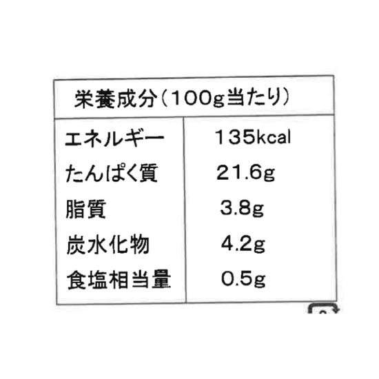 | 栄養成分 | (100gあたり)エネルギー:135Kcal、たんぱく質:21.6g、脂質:3.8g、炭水化物:4.2g、食塩相当量:0.5g |