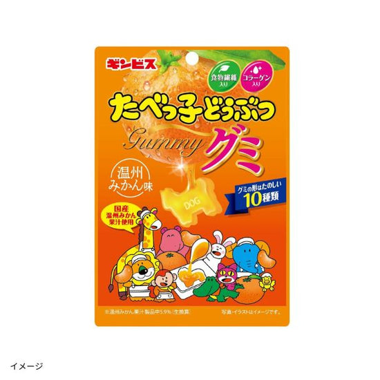 グミの形はたべっ子どうぶつのビスケットと同じ形のどうぶつ型のグミが全部で10種類九州産の温州みかんを使用した、ほんのり酸味のあるジューシーな味わいが口の中に広がります。弾力のある噛み応え抜群の食感です。仕事や勉強、スポーツの合間や集中したい時などに様々な場面で食べられます。パッケージのデザインはたべっ子どうぶつたちがグミを作る様子が可愛く描かれ、集めたくなる4パターンのデザインです。便利なチャック付きの袋で、いつでもどこでも持ち運べます。