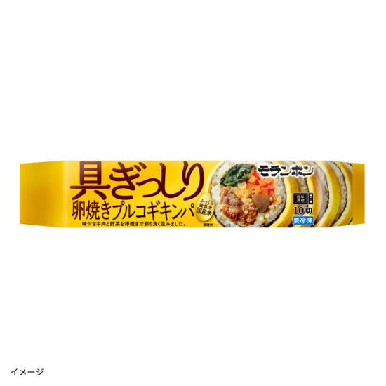 味付けした牛肉と人参、ほうれん草、ごぼう、割り干し大根入りの手作りキンパを卵焼きで包みました。