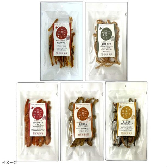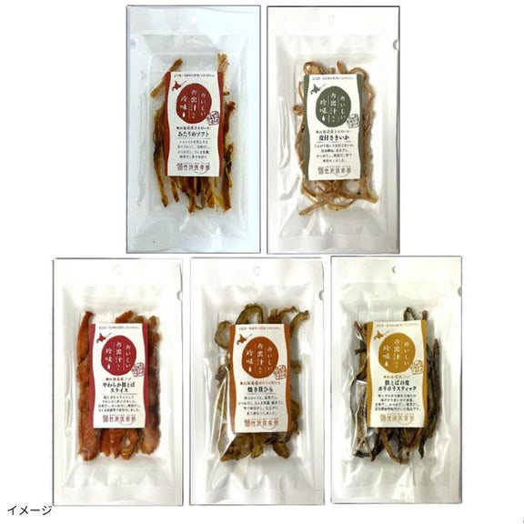 | 内容量 | あたりめソフト:18g、皮付さきいか:18g、鮭とばスライス:23g、 焼き貝ひも:34g、鮭とば皮ポリポリ:17g/セット |