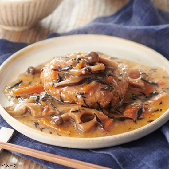 ひじき、しいたけ、しめじ、れんこんなど生姜の風味が優しく広がる具沢山のみぞれソースとしっかりとした肉感のあるパテが特徴のハンバーグです。