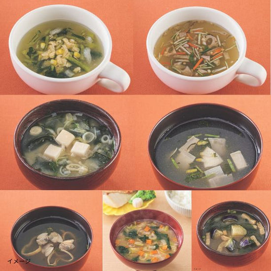 | 内容量 | 揚げ茄子のお味噌汁:28.8g(7.2g×4食)、豆腐のお味噌汁:28g(7g×4食)、野菜のお味噌汁:28g(7g×4食)、贅沢ゆばのお吸い物:16.2g(5.4g×3食)、はまぐりのお吸い物:15g(5g×3食)、しょうがと根菜のスープ:15g(5g×3食)、国産野菜とたまごのスープ:32.4g(8.1g×4食)/セット |