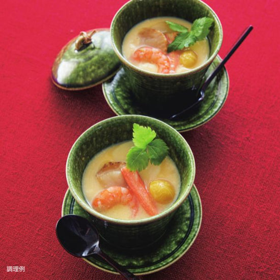 | 原材料名 | 豆乳、鶏卵(国産)、ほたて(国産)、だし(しょうゆ、糖類(果糖ぶどう糖液糖、砂糖)、アミノ酸液、食塩、米発酵調味料、かつおエキス、しいたけエキス、酵母エキス、昆布)、しいたけ(国産)、えび、鶏肉(国産)、かつおかれぶしだし、銀杏(国産)、かまぼこ、かに(国産)、(一部に小麦・卵・えび・かに・大豆・鶏肉を含む) |