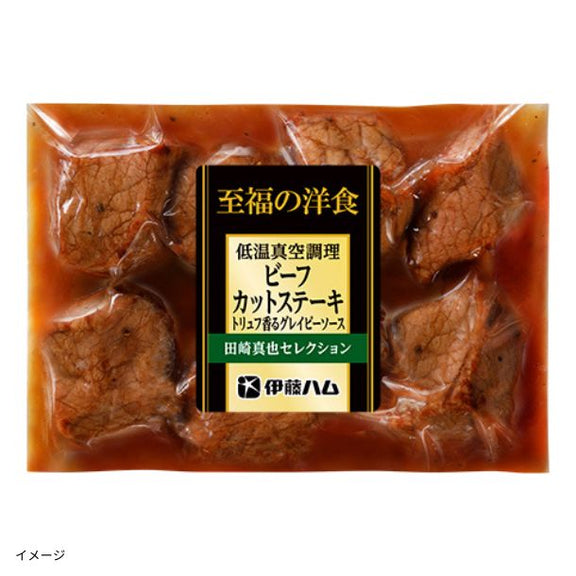 お肉を一口大にカットして表面を焼き上げた後ソースと一緒に袋に真空封入し低温でじっくりと加熱した柔らかく旨みたっぷりのカットステーキです。ステーキソースを使用しました。