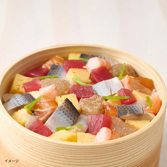 まぐろ、いか、海老、サーモン、真鯛、こはだを贅沢に使った海鮮ちらしの冷凍商品。それぞれの食材に味付けをしているので、最後まで飽きない美味しさをお楽しみいただけます。 隠し味として、刻み山くらげと茎わかめをご飯の上に敷き詰め、旨味と食感をプラス。海苔とわさびの佃煮を仕込むことで、コクとアクセントのある味わいに仕上げました。