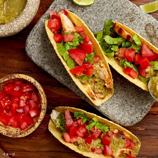 | 原材料名 | 【タコシェル】とうもろこし粉、植物油脂 【タコソース(マイルド)】トマト・ジュースづけ、トマトペースト、玉ねぎフレーク、食塩、砂糖、グリーンチリペッパー、パプリカ、玉ねぎパウダー、にんにくパウダー/増粘剤(加工デンプン)、pH調整剤、安定剤(塩化Ca) 【タコシーズニング】香辛料(パプリカ、クミン、カイエンペッパー)、食塩、乾燥玉ねぎ、マルトデキストリン、コーンスターチ、乾燥にんにく、オレガノ、酵母エキス、マジョラム/リン酸Ca、パプリカ色素 |