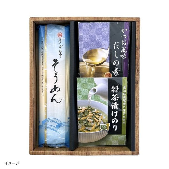 そうめんと、だしの素、にゅうめんにも使えるお茶漬けの素の詰合せです。