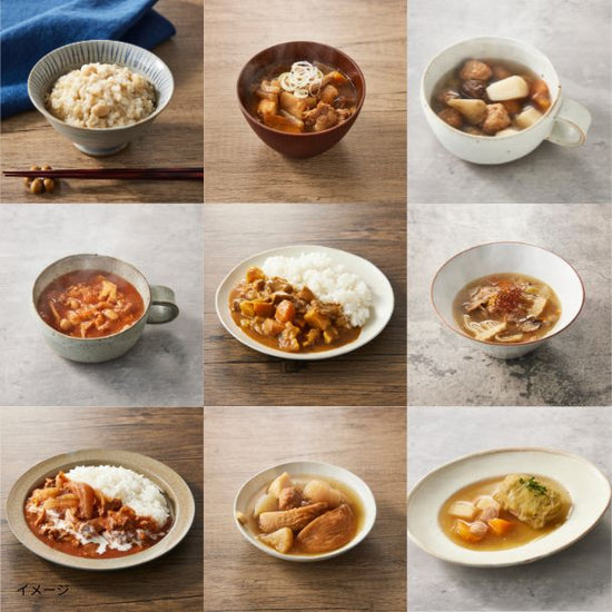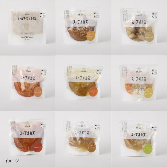 うちのや創業50年のブランドリニューアルに伴い、新しく発売をした オールマイティライス、スープオカズ、定番のおかずを詰め合わせしたセットです。