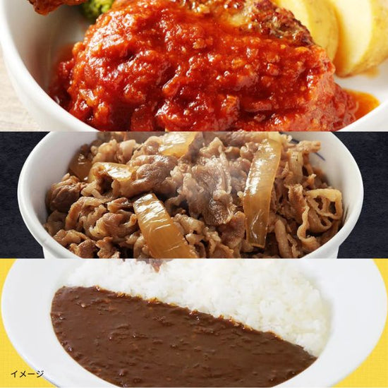 | 内容量 | うまトマハンバーグ:(ハンバーグ80g、うまトマソース70g)×7食、 プレミアム牛めしの具:135g×7食、 カレー:180g×7食/セット |