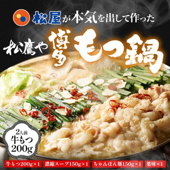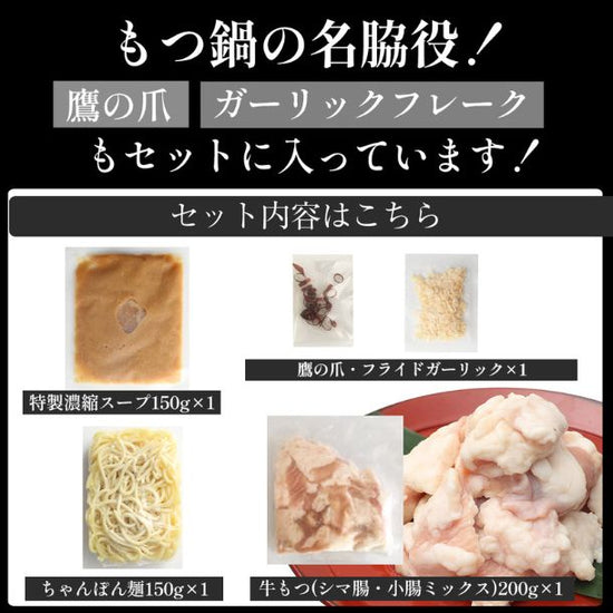 | 内容量 | 牛めし:135g×25食、博多もつ鍋セット:2人前(牛もつ200g×1、濃縮スープ150g×1、ちゃんぽん麺150g×1、薬味(ガーリックフレーク、唐辛子)×1)/セット |